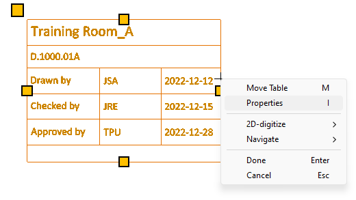 • You can edit the table properties by selecting Properties (I) from the context menu.