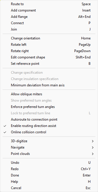In ducting, the right-click menu includes the following options. Some of these are only displayed when routing duct parts, while others are also available in other contexts.