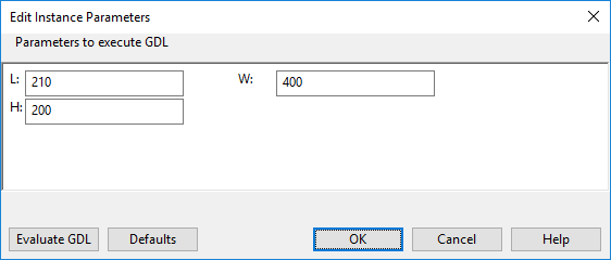 Edit the parameter values as required, and then click Evaluate GDL to test the effect of the new values in the active view. Default restores the default instance parameter values.