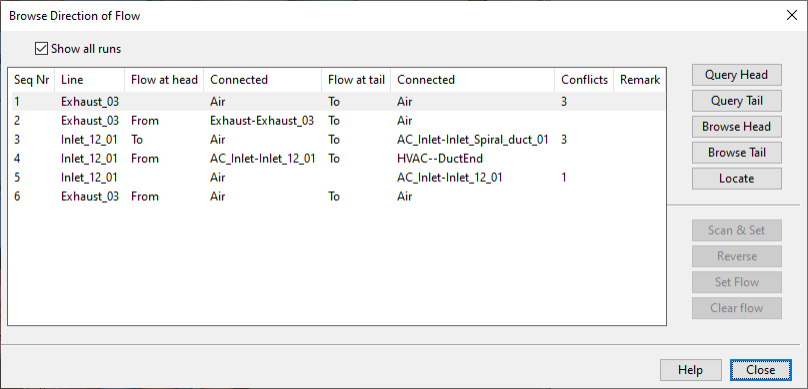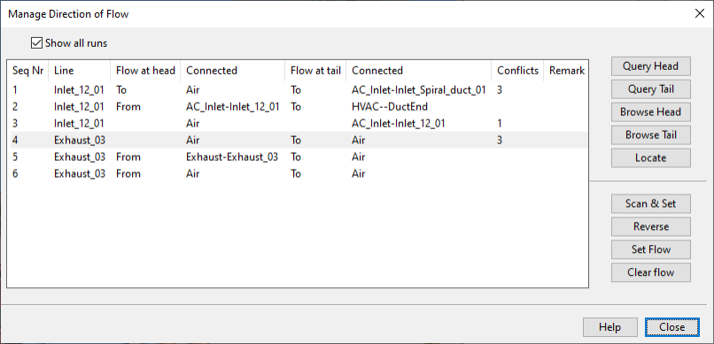 Pick one or more duct parts from the model and press Enter. The Manage Direction of Flow dialog opens, listing the duct runs of the picked parts and information about them.
