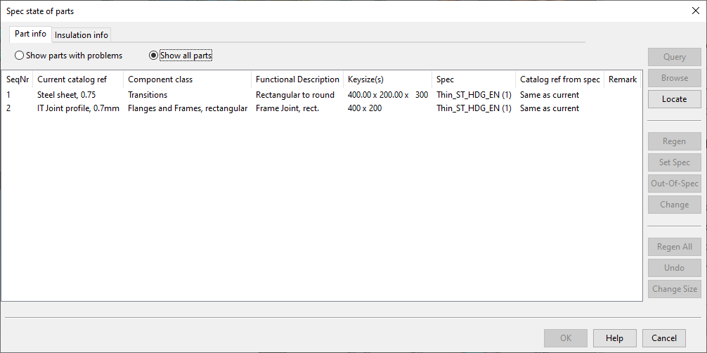 Select one or more air duct parts from the model and press Enter. The Spec state of parts dialog opens, displaying the specification status of the selected parts.
