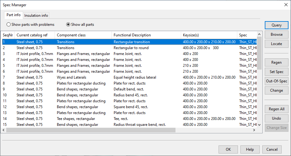 The program uses the current key size, specification, and functional description to find the given part from the specification and check what its Catalog Part should be. Then the duct part is set to use the intended Catalog Part.