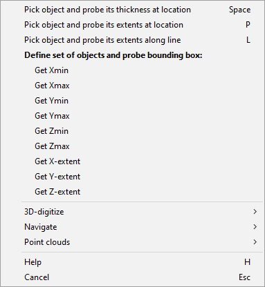 Probe – Allows probing the value from the model. Right-click the work view to select the appropriate probing action, and then pick the object(s) from which to probe the value.