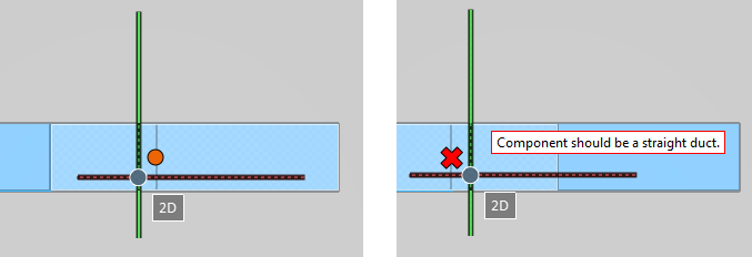 In a work view, move the cursor to the location where the join should be made. When a connection point is displayed, click to join the ducts. If the ducts cannot be joined, for example because one of them is a duct component instead of a straight duct piece, a red X is displayed and an on-screen message indicates why the operation is not possible.