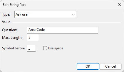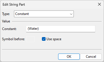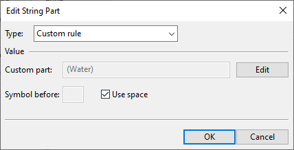Insert the required rules; you can separate the value generated by each rule from the previous value with a rule-specific separator character. To start creating a new rule, click Add. The Edit String Part dialog opens.