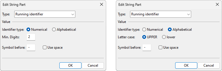 In the Identifier type setting, select whether to use a numerical identifier (with a given minimum number of digits) or an alphabetical identifier (in upper- or lower-case letters).