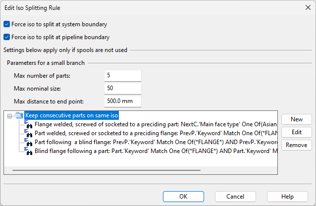 In the Edit Iso Splitting Rule dialog, you can change the splitting rules that are applied when the user starts to create new isometric groups from the Production Tree pane. An isometric group represents the set of parts that can be shown in an isometric drawing, and with these rules you can define when a piping part should or should not start a new isometric group.