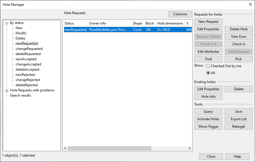 Opening the Hole Manager dialog makes all hole request objects in the area model visible, and the program runs automatic retargeting for hole requests that are currently checked out to you; the hole request objects will be hidden again when you close the tool.