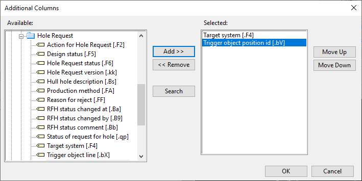 If you have added columns for both hole requests and target objects, the hole request related columns are listed first, as shown below.