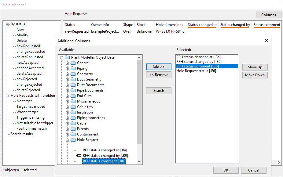 To see the status information in the dialog, add the relevant fields with the Columns button, as described in Hole request list.