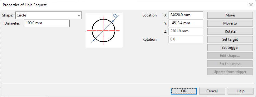 • Not suitable for trigger – The parameters (shape, size, location, orientation) of the hole request and the trigger object do not match. You can use the Update from trigger command to update the hole request, as described in Properties of Hole Request.