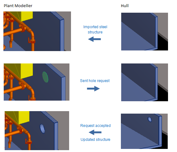 The Hole Manager tool manages the workflow between the design groups and allows everybody to easily check the status of each hole and hole request. For example, when the hull of a ship is designed in CADMATIC Hull, in Plant Modeller a piping designer or layout designer can request a hole to be made in the hull structure. The request is sent from Plant Modeller to Hull, and then the hull designers can accept or reject the making of the hole.
