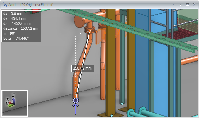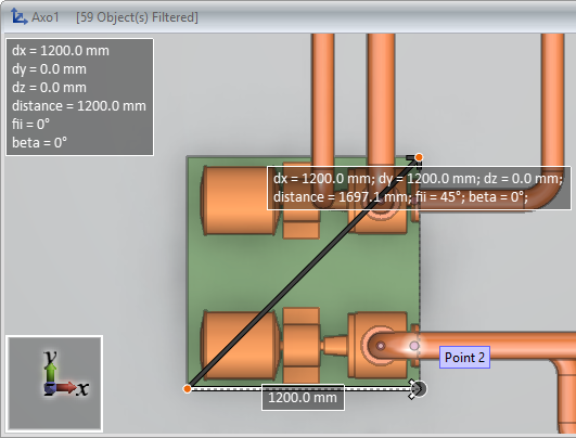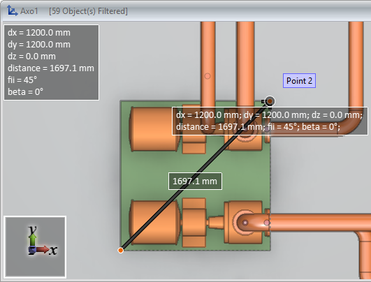 Navigate to the second measurement point. As you move the cursor, the direct distance from the base point to the current cursor location is displayed next to the cursor. In the top-left corner of the view, you can see the direct distance as well as additional information such as the distance the cursor has traveled in X, Y and Z direction.