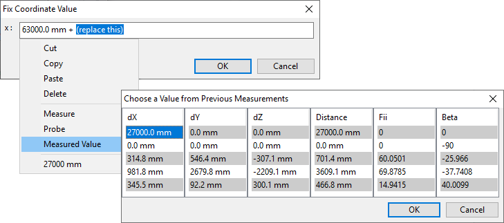 In dialogs where you can enter a numeric value into a field, you can select the value from automatically stored measurement values.