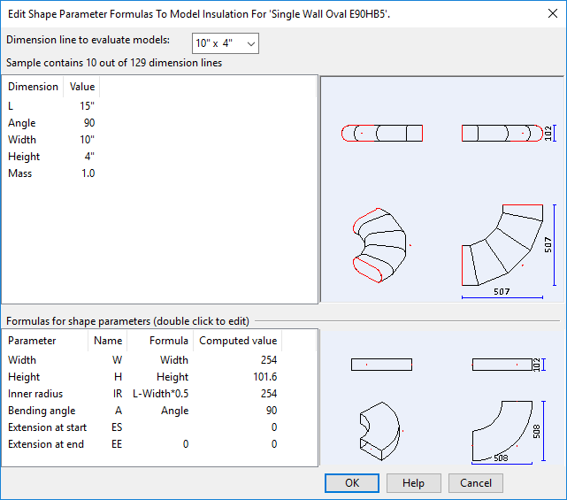 The Dimension line to evaluate models field lists the first ten Catalog Part sizes of the air duct part. When you select a sample part size from the list, you can see its dimensions as a list and also graphical representations of the part. These are shown just to make it easier to refer to dimension names in the formulas.