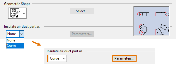 In the Insulate air duct part as section, select the geometric shape of the insulation. The Parameters button is enabled.