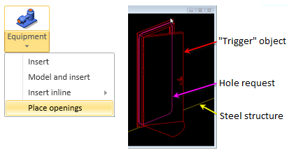 If the component requires a hole in a steel structure, you can use the Place openings command to insert the component and create the hole request at the same time.