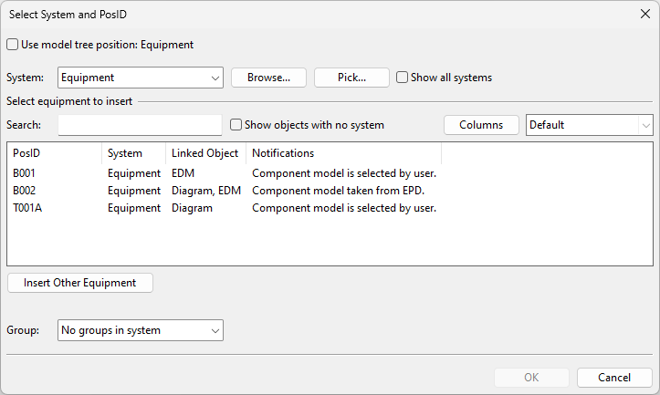 2. On the Layout tab, select Equipment > Insert (Alt+E). The Select System and PosID dialog opens, listing integration objects that can potentially be linked to the model object.