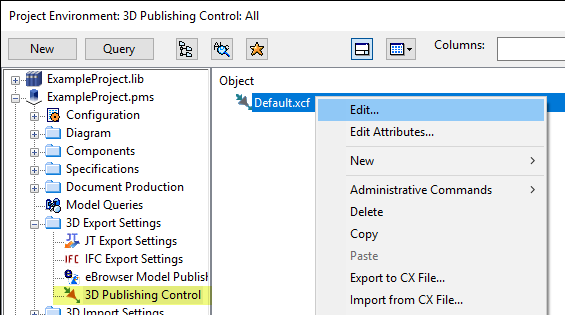 Usually there is at least a sample 3D publishing control Default.xcf that you can use to publish a few hierarchies and some basic object attributes into eBrowser models. We recommend that you use the default publishing control as a template for creating your own custom publishing control that publishes all the information that you need to see in eBrowser. If Default.xcf does not exist, you can select New > 3D Publishing Control to create a new publishing control that contains the default configuration.