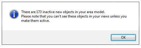 Tip: This command activates also objects that have been inactivated in the inactivity filter as described in Inactivity filter, but it does not change your filter selections. Therefore, if you just open the In-Activity Filter dialog and click OK, your existing filter selections are re-applied to the model area.