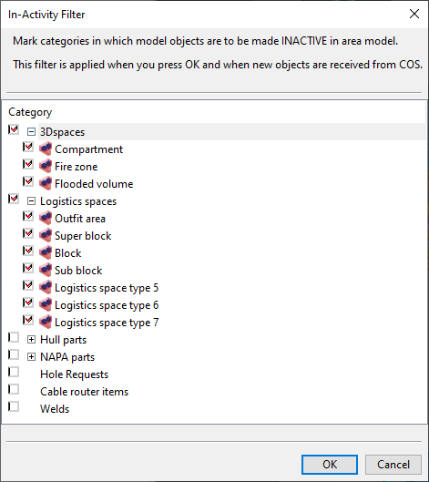 Select Model > Active Objects > Inactivity filter. The In-Activity Filter dialog opens.