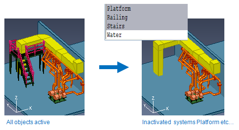 In CADMATIC, the term "active object" refers to a property of model objects that defines whether object can be shown in the views of the active design area. Users can temporarily hide objects by setting them as inactive.