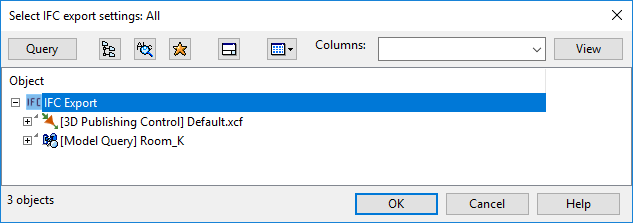 - The project database contains a suitable export configuration. This configuration defines the 3D publishing control to use, the model query to use for selecting the objects to export, and other export settings, as described in IFC export settings. The publishing control can also contain tags that publish insulation attributes.