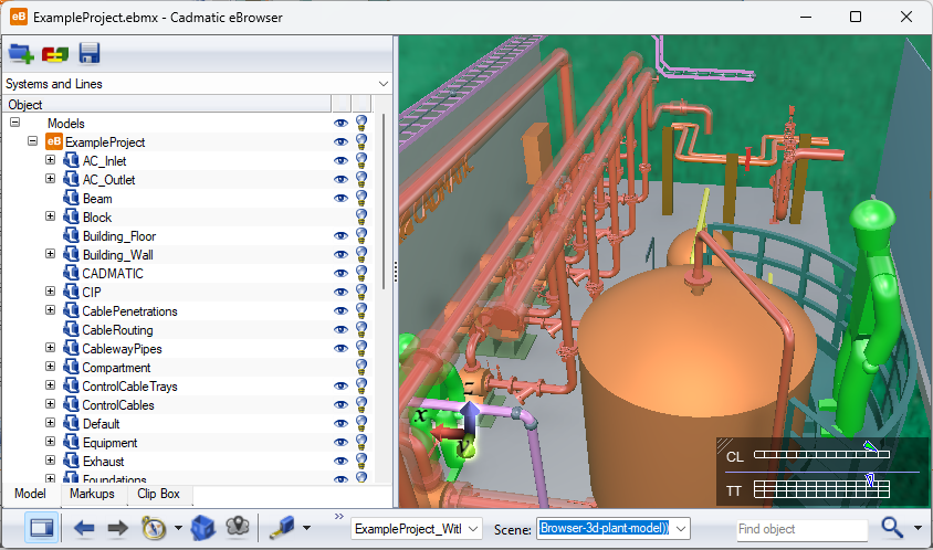 An eBrowser model is a stand-alone 3D model file that has an .ebmx or .ebm file extension and contains 3D model information associated with the 3D model objects of a project. eBrowser models can be published (exported) from Plant Modeller either automatically using the Plant Modeller service as described in Plant Modeller services or manually as described below. A published model can contain the complete design or just specific parts of it, and you can publish as many different kinds of model instances as required.