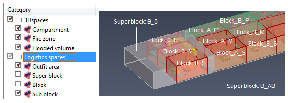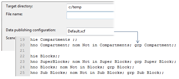 The 3D Publishing Control file used in publishing includes the definition of hierarchies to be included in the model. You have to modify the file to match your current project and your publishing needs. In the following example, the publishing control creates hierarchies for Compartments and Blocks (including superblocks, blocks and sub blocks). If only Super Blocks and Blocks are active when publishing, the Compartments hierarchy will be empty in the model file. See 3D publishing control for more information on 3D publishing controls.