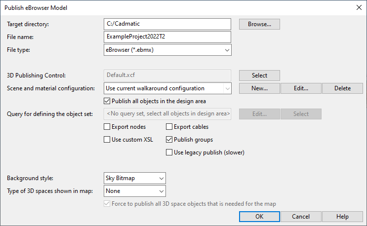 If you selected Publish from set, or if you are creating a new export or modifying an existing export, a Publish eBrowser Model dialog opens for defining the publishing parameters. Enter the following information and click OK (when publishing from a set, this performs the publishing).