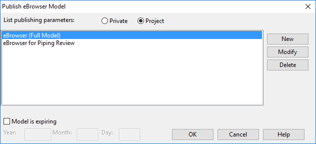 If you selected Publish or Publish several models, a Publish eBrowser Model dialog opens for selecting models and specifying their expiration.