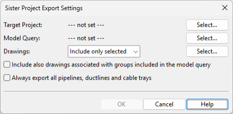 Model Query – Click Select to select a model query that picks the objects that are to be exported to the target project. Also dependent objects that the query does not specifically select are exported, as described in Sister project model query and dependent objects.