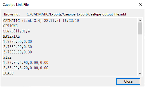 You can export piping information to a CAEPIPE model batch file (*.mbf; ASCII format) that can then be imported to CAEPIPE software for stress analysis. Optionally, you can also output a DWG or PDF file that shows the exported geometry.