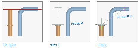 Step 1: route a new pipe and move cursor near the flange connection. Press P to lock cursor in that connection. Because direction is locked, you have to release cursor by pressing Shift+A.