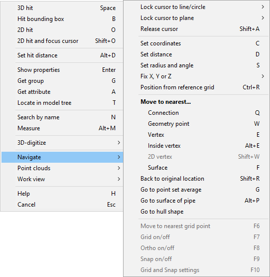 Selecting Navigate from the context menu of a view displays the following commands. All 3D navigation commands require at least part of the referenced object to be visible, so that the navigation would not erroneously select a point, centerline, edge, surface or face from an object that is near the cursor but not visible to the user.