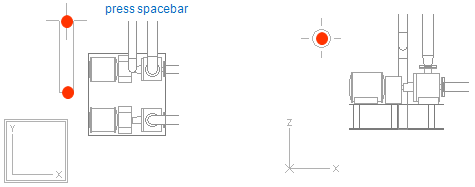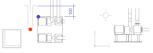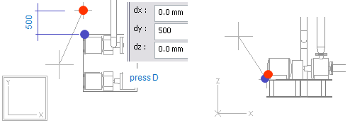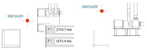 Y coordinate for end point locates 500 from vertex of the pump foundation. First you have to lock cursor to the vertex. To ensure that software can find that vertex in XY view, enable 2D hit pressing Ctrl+2. Now nearby evaluation during navigation is performed in the active view ignoring the depth coordinate. When 2D hit mode is enabled there is a double frame drawn around the coordinate axis marker in the active view. Otherwise there is only single frame.