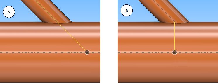 Move to a geometry point that relates to a branch pipe. The command can snap to the intersection point of the centerlines of the branch pipe and the main run, as in example A below. If the branch is eccentric (that is, if the centerlines do not intersect), then the point is located along the main run, closest to the branch centerline.