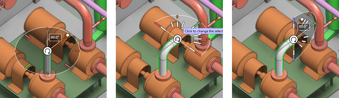 In pipe routing, when you have selected the starting point or an intermediate routing point and Use routing direction assist is enabled in the context menu, a graphical tool is displayed for selecting the next routing direction. For more details, see Use routing direction assist.