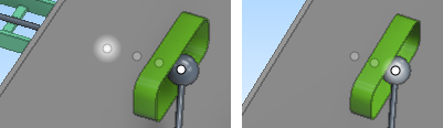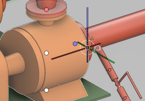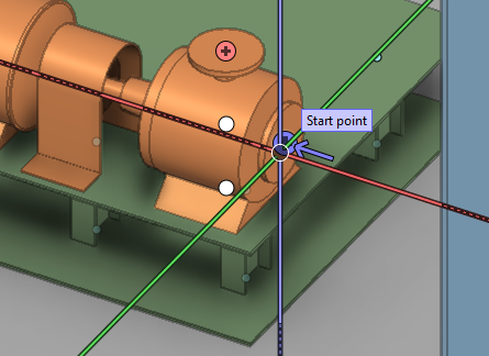 In the Plant Modeller user interface options described in Assistance geometry, you can select whether to display and highlight assistance points in shaded views. When at least some assistance point types are enabled and you stop moving the cursor, the active view displays points that are located within the maximum search distance defined in the options. Some of the point types are only visible in Component Modeller.