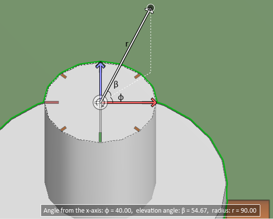 After using the Set radius and angle (S) command, but also in some other contexts, the smart cursor visualizes the phi (f) and beta (b) angles, and the spherical coordinates are also shown as text at the bottom of the screen.