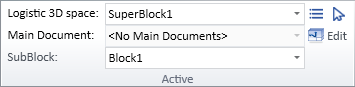 On the Pipe Spools tab, the Active group allows you to select a logistics 3D space and a main document that is hosted by the selected 3D space.