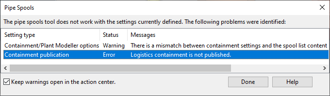 Problems that prevent the proper usage of the tools on the Pipe Spools tab are logged in the Plant Modeller action center.