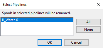 In this example, selecting only "Spool JJ_Water-01-01" would rename also "Spool JJ_Water-01-02" in the same pipeline (JJ_Water-01), but the other spools are in different pipelines and would not be renamed.