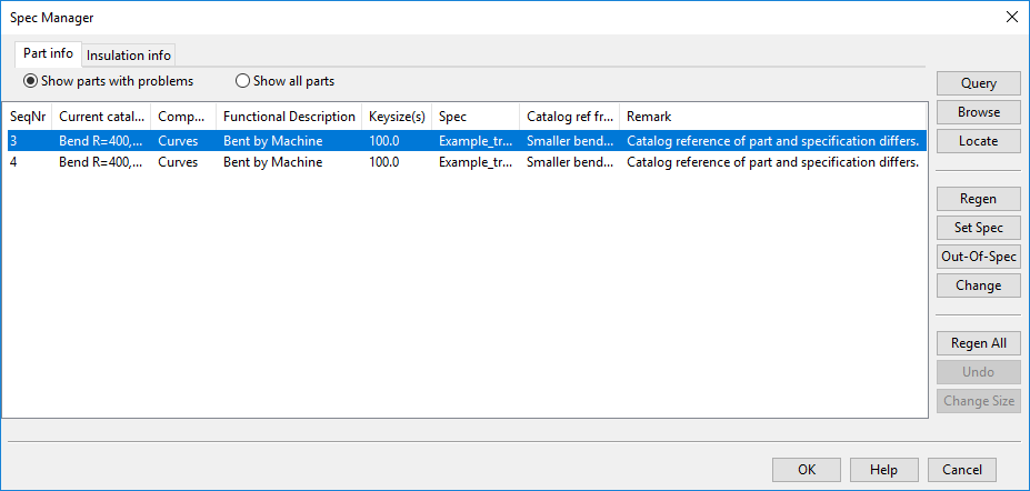 Specification check results open the Spec Manager window. This is the same window that opens when do a specification check manually from Piping > Check / Change > Check specification status—see Check / Change for details.