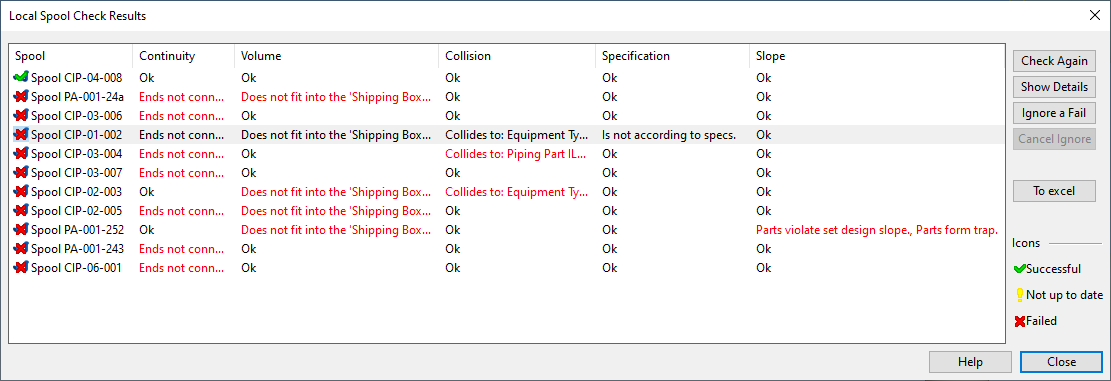 You can set a failed check to "Ignored" status by clicking Ignore a Fail. If more than one check has failed, you are prompted to select which one to ignore. The ignored checks will be skipped if you re-check the pipe spools.