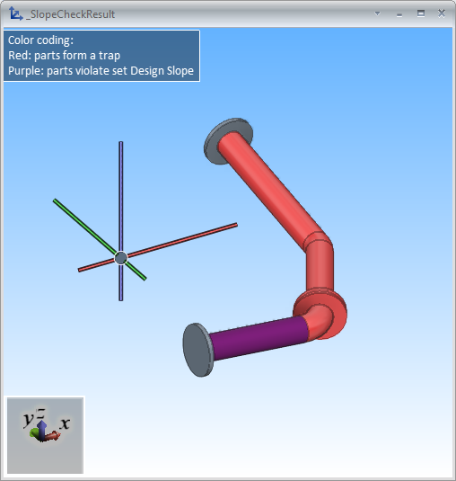 Slope check results open a separate view that displays parts that might form a trap that can prevent the gravitational flow of liquids out of the pipe and parts whose slope is less than the specified design slope.