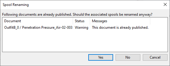 If the document has been published already, Spool Renaming dialog opens. Select Yes to rename the spools anyway or No to cancel the renaming.