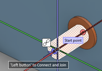 Moving the cursor near the connection point of a pipe end displays a visual cue (interlinked chains) and an on-screen hint to indicate that clicking will perform a Join. If it is not an open pipe end, like when there is a flange at the end, the suggested action is just Connect.