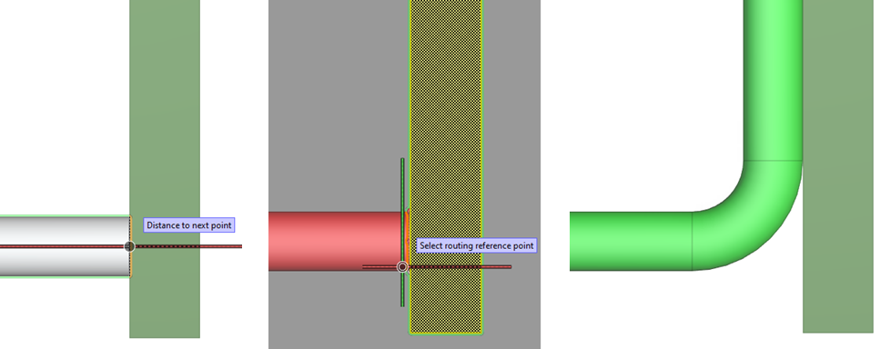 Selecting a quadrant point as the reference point and using a selection plane that is perpendicular to the previous straight piping part forces an angle of at least 90 degrees, if possible. In the example below, a pipe is first routed to a wall, the reference point is changed to the side of the pipe, and then routing continues along the surface of the wall.