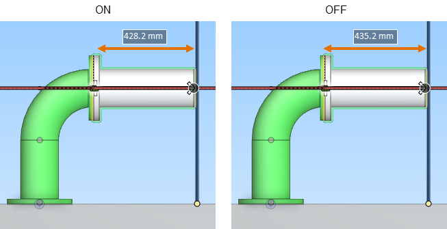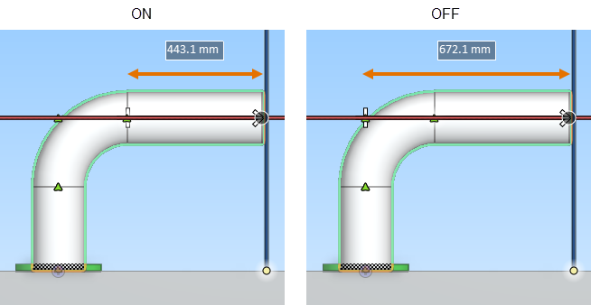 When enabled, the distance values in the on-screen tool and in the status bar show the length of the straight piping part that is currently being routed in a locked direction. When disabled (default):